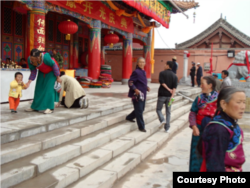 Tot punîndu-ne ceai şi ciugulind din pîine, am lăsat să treacă timpul pe lîngă noi. Un sfert de oră – jumătate – trei sferturi... La plecare, punem cîte 10 yuani sub talger (9,6 yauni = 1 euro), în semn de recunoştinţă, chit că ospitalitatea nu are preţ. Apoi urcăm la celălalt nivel, în curtea principală, în mijlocul căreia se înalţă un fel de pom de crăciun din fier împodobit cu clopoţei – cînd bate vîntul, clinchetul lor „spune” rugăciuni.