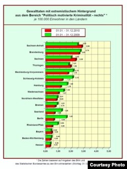 Ministrul federal de interne Hans-Peter Friedrich (CSU) şi Heinz Fromm, directorul serviciului de informaţii interne (Bundesamt für Verfassungsschutz) au prezentat la sfîrşitul săptămînii trecute raportul anual al Oficiului federal pentru protecţia Constituţiei. Anul trecut s-a înregistrat o uşoară scădere a infracţiunilor cu substrat extremist, faţă de anul 2009.