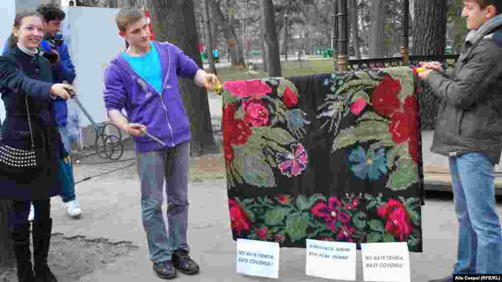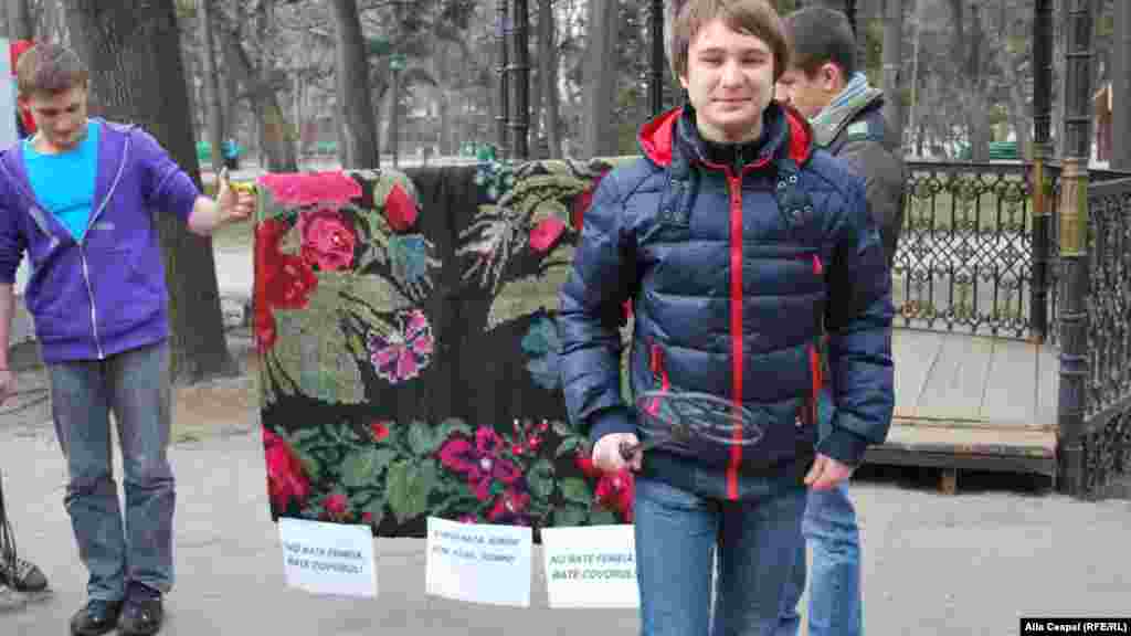 De ziua femeii, tinerii de la Centrul Media - o organizație neguvernamentală creata în Moldova cu sprijinul UNICEF, cu scopul de a instrui tinerii in diverse domenii - au organizat un flash-mob (adunare spontană de oameni, n. red) la Chișinău și unul la Soroca împotriva violenței asupra femeilor. Inițiativa acțiunii, mai putin obișnuită pentru ziua când de obicei se vorbește numai despre lucruri bune și se fac complimente femeilor, se datorează faptului că violenţa împotriva femeilor este un fenomen răspândit în societatea moldovenească. Fotografii de Alla Ceapai.