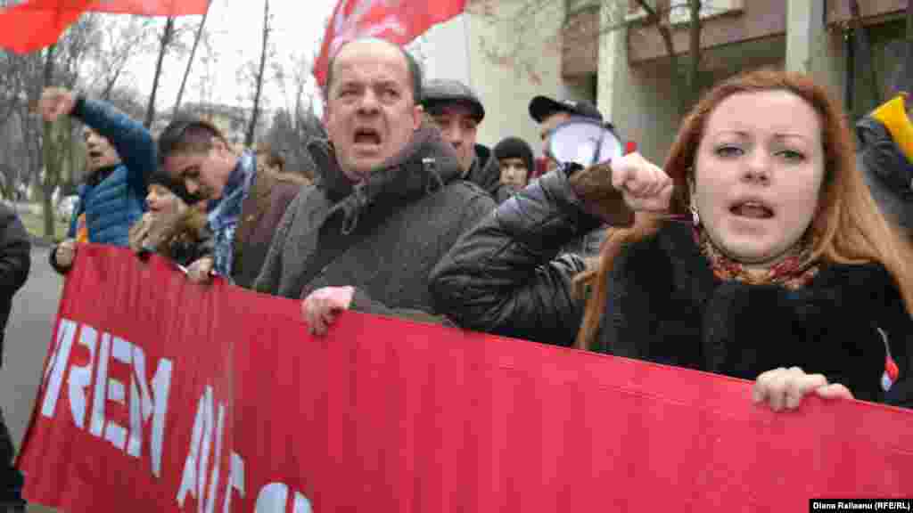 Câteva sute de membri şi simpatizanţi ai Partidului Comuniştilor, în frunte cu liderul partidului, Vladmir Voronin, au protestat în faţa Palatului Republicii, cerând alegeri anticipate şi legalizarea simbolurilor comuniste, secera şi ciocanul. Protestul a continuat în faţa Preşedinţiei.