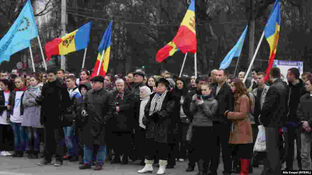 Primăria orașului Chișinău și Partidul Liberal au organizat un miting de comemorare a evenimentelor din aprilie 2009, la patru ani de la manifestaţiile de protest din aprilie 2009, provocate de victoria partidului comuniştilor în alegerile parlamentare. Mitingul de protest din 7 aprilie 2009 a degenerat în acte de violenţă, soldate cu moartea unei persoane, Valeriu Boboc. Mulţi din tinerii protestatari au fost reţinuţi şi se pare maltrataţi în arestul poliţiei în aprilie 2009. (Foto: corespondenta Europei Libere Alla Ceapai)