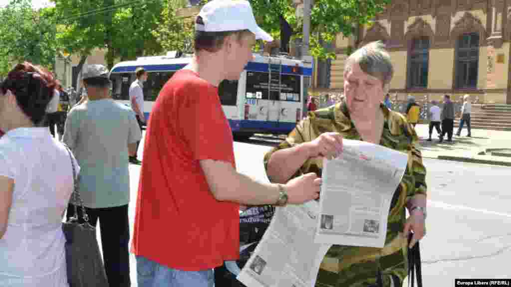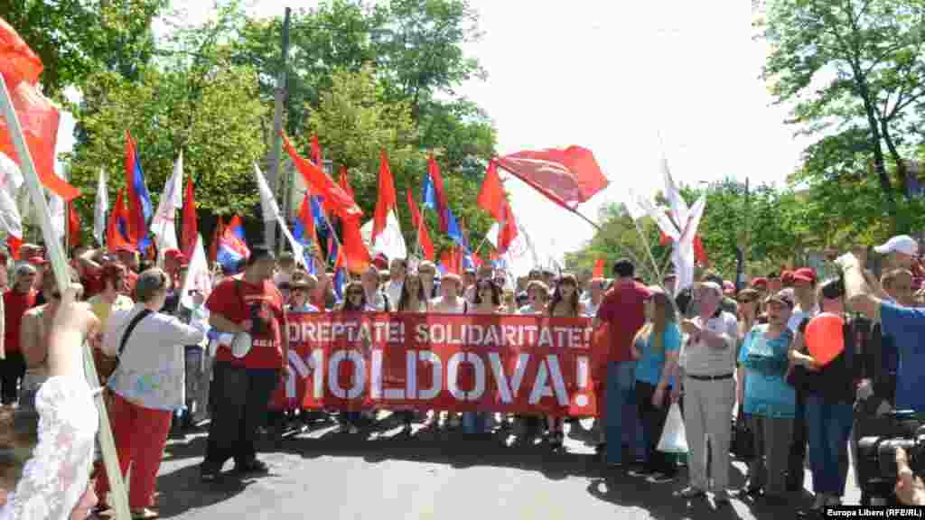 De ziua Internaţională a muncii, simpatizanţii şi membrii Partidului Comuniştilor s-au adunat la o acţiune în faţa Academiei de Ştiinţe, după care au mărşăluit cu steaguri şi pancarte pe bulevardul Stefan cel Mare si Sfant din Chişinău. Manifestanţii scandau ,,Alegeri, dreptate, solidaritate” şi şi-au exprimat nemulţumirea faţă de actuala conducere a ţării. (foto: Tamara Grejdeanu)