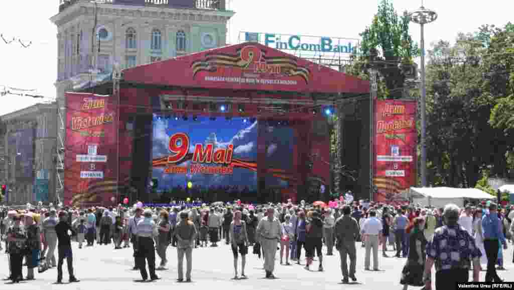 Mii de oameni au venit la concertul organizat de Ambasada Federației Ruse unde au fost invitați să cânte vedetele ruse Iosif Cobzon și Lev Lescenko. Sute de politisti asigura ordinea publica. Mai multe persoane cu panglica Sf. Gheorghe la piept, sau îmbrăcate în uniforme sovietice și purtand drapele roșii, au împînzit Piața Marii Adunări Nationale unde este sărbătorită cu mare fast Ziua Victoriei. Unionistii protestează împotriva acestei manifestații rusești și marchează prin doliu ziua de 9 mai la Chișinău. (foto Valentina Ursu și Victor Lutenco)