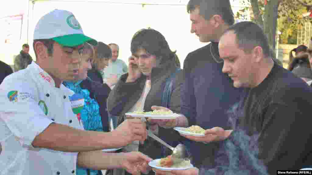 Echipa de bucătari din Uzbekistan pregăteşte o mâncare tradiţională uzbecă pentru publicul de la Campionatul gastronomic internaţional din Chişinău.