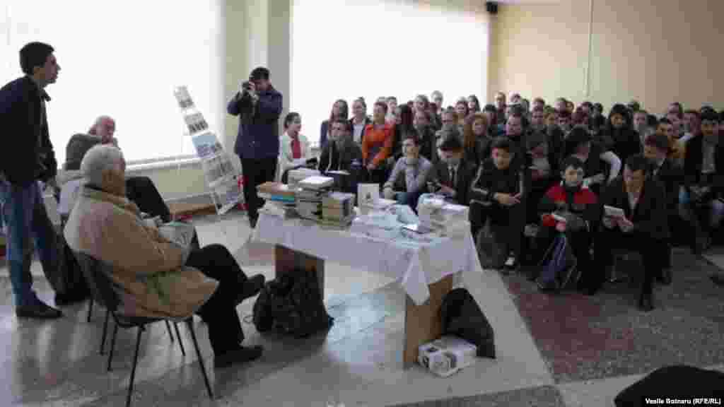 Scriitorul Vladimir Beşleagă şi tinerii de la liceul Mihai Eminescu din Comrat