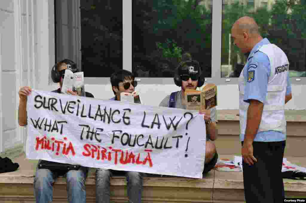 Legile supravegherii se află aîn faza de promulgare de către Președintele României. Acțiunea de joi din fața sediului Serviciului Român de Informații este un preambul la protestul care va avea loc sâmbătă, 12 iulie 2014, la sediul central al SRI din capitala României (Bulevardul Libertății Nr. 14). Galerie foto și text de Mihai Stan.