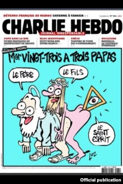 Așadar, caricatura asta cu Trinitatea… contextul era cel al căsătoriilor gay. Aici, in mod surprinzător, Franța republicană s-a regăsit deodată mai conservatoare decât regatele vecine: Belgia, Olanda, Luxembourg. Au avut loc manifestații uriașe organizate de dreapta conservatoare și de Frontul Național al lui Le Pen, luări de poziții publice, principalul partid de opoziție, UMP, Uniunea pentru o Mișcare Populară, partidul fostului președinte Nicolas Sarkozy, cerînd chiar un referendum național – care a fost respins în cele din urmă de Parlament.