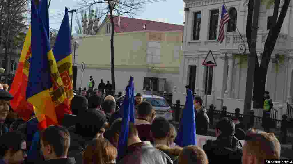Partidul Socialiştilor (PSRM) de orientare pro-rusă a pichetat astăzi Ambasada României şi Ambasada SUA de la Chişinău pentru a critica ceea ce PSRM consideră a fi sprijinul politic nemeritat acordat de Occident guvernării de la Chișinău. Socialiştii au protestat şi la Centrul de documentare şi informare NATO, unde au scandat „NATO, afară!” şi „Moldova, stat neutru!”. La protest au participat până la 100 de membri şi simpatizanți ai PSRM. Manifestația a decurs fără incidente.