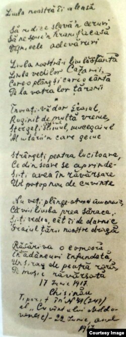Să fi fost o persoană fizică – şi nu-i greu să ne-o imagină, cu părul strâns în coc şi purtând haine de epocă –, poezia Limba noastră de Alexie Mateevici (1888-1917) ar trebui să-şi sufle, în aceste zile de iunie 2017, cele 100 de lumânări de pe tortul de sărbătoare, punându-şi o dorinţă. Una cât pentru un secol. La un an înainte de centenarul Marii Uniri din 1918. Scrisă pe 17 iunie şi rostită pe 21 iunie 1917, în cadrul cursurilor de limbă română pentru învăţătorii moldoveni (19 – 21 iunie 1917, Chişinău), publicată la scurt timp în „Cuvânt moldovenesc”, Limba noastră – de la G. Călinescu citire – conţine „imagini superioare de mare poezie” şi este nu doar testamentul unui poet „care a văzut în limbă spaţiul sacru al identităţii naţionale şi făclia din care neamul să-şi tragă izbânzile sale” (Dumitru Irimia), ci şi, din 1994, imnul de stat al Republicii Moldova – probabil singura ţară de pe glob în care populaţia băştinaşă îşi vorbeşte atât de aproximativ limba maternă –, sabotat şi el ori de câte ori a fost cu putinţă, după cum se întâmpla pe 14 iulie 2009, la recepţia dată de Ambasada Franţei, când soprana Liliana Marin şi tenorul Sergiu Pilipeţchi s-au poticnit la strofa a doua a imnului, reluând prima strofă pe post de refren. (Adaug, în paranteze, că poezia era „amputată” în ediţiile sovietice ale operei lui Alexie Mateevici de strofa a şaptea: „Limba noastră îi aleasă/ Să ridice slavă-n ceruri,/ Să ne spună-n hram şi-acasă/ Veşnicele adevăruri”, căci, de bună seamă, monopolul „adevărului” îi aparţinea Partidului, care vorbea nu din „hram”, ci de la Kremlin.)