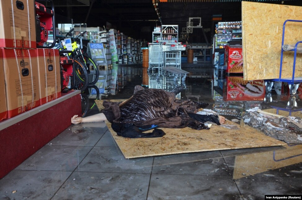 Trupul acoperit cu o pătură al unei persoane ucise în timpul atacului asupra unui magazin din Herson.