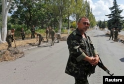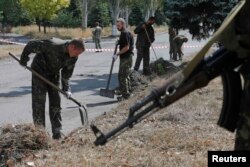 Militari din forțele guvernamentale, capturați de separatiști, curăță o stradă în Snijne, lângă Donețk, 29 august, 2014